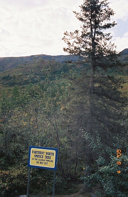 North of Coldfoot is this black spruce. As the sign indicates it is the northern most spruce on the Dalton Highway. Sadly, and proving once again that the two most abundant elements in the universe are hydrogen and stupidity, someone has girdled the tree and it not likely to survive. Soon it will be time to select another tree as the northern most.