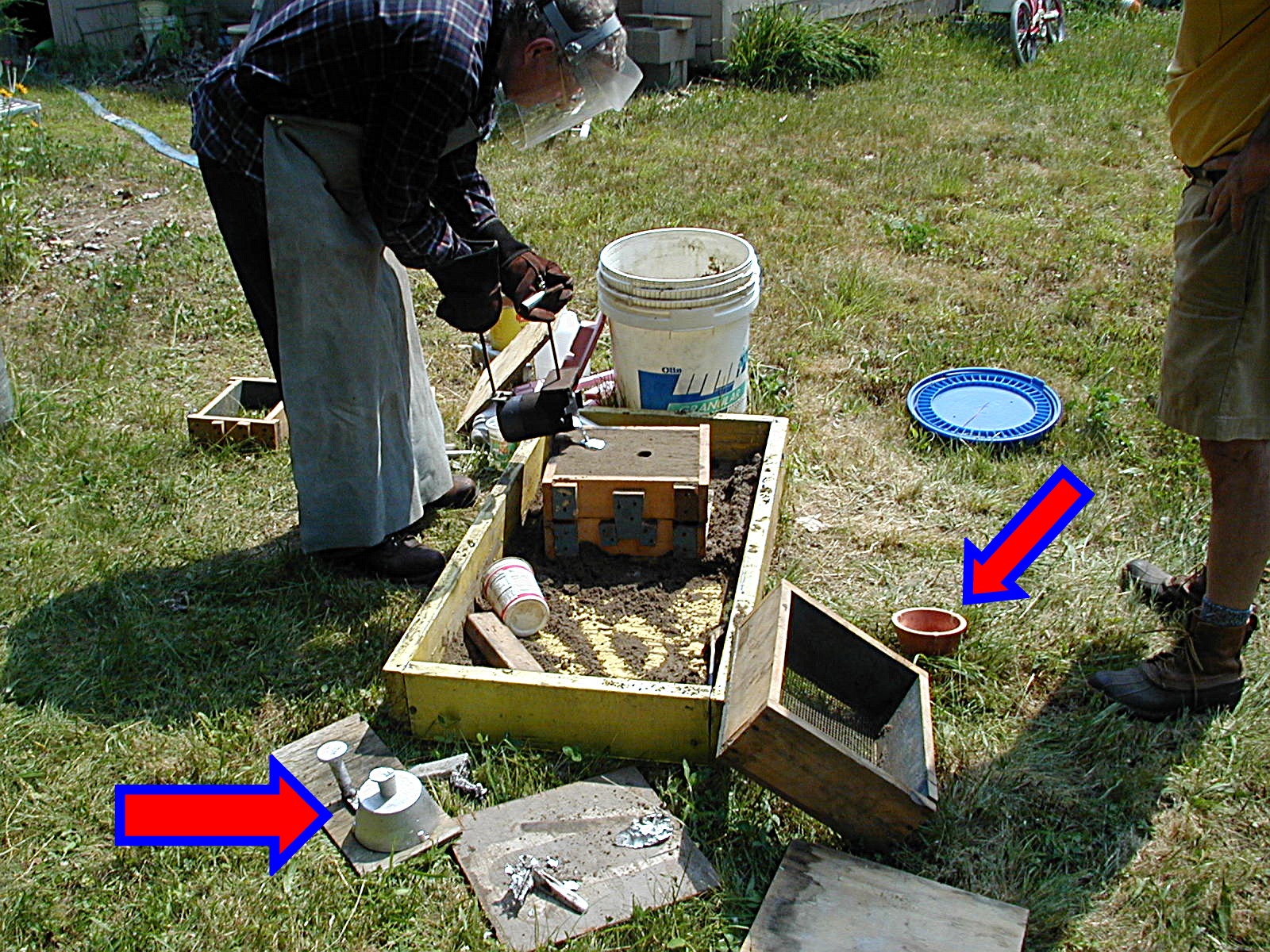 Another view of the pouring operation The left arrow points to a cast part and the right arrow points to the pattern used in making the moulds