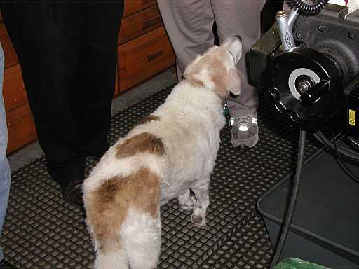 Every shop ought to have a "shop hound" and this is the one that haunts Rollie's shop. Right here its' attention is riveted by something that one of the fellows is eating. Sorry, I don't know the dog's name.