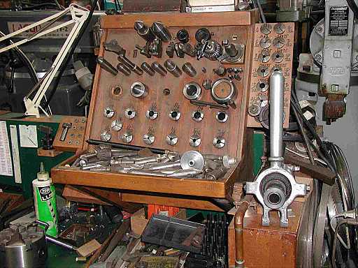 Behind the operator at the lathe is this rack for collets and other accessories.