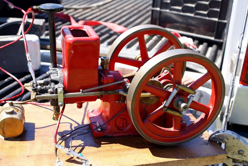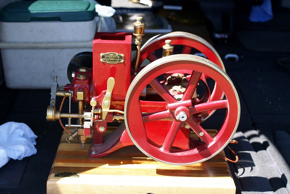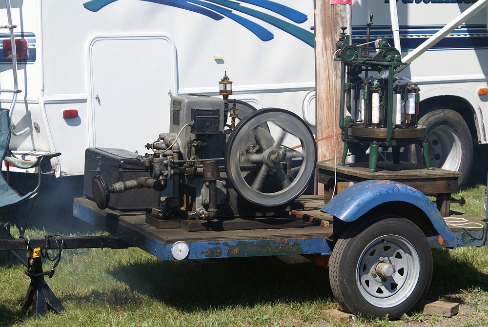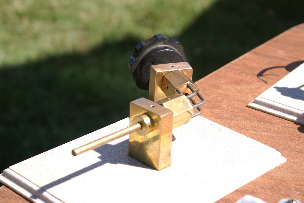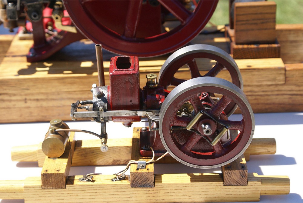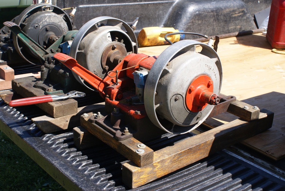 The device with the orange fly wheel is what I refer to as an electric "one lunger". When a small pin rotating with the shaft hits a brass brush assembly the solenoid is activated and turns the flywheel. The brush assembly is a piece of thin brass sheet bent in such a way that the pin contacts it at the proper point of rotation to keep the engine turning. The brass brush is bent in such a way that the amount of revolution with the pin connected can be varied setting the speed. The barely visible brass loop seen at the top of the device controls the contact period and hence the speed.