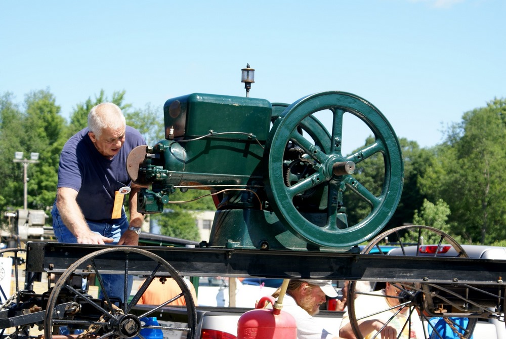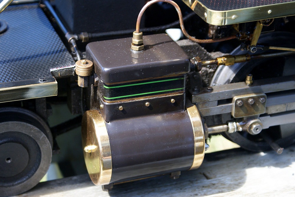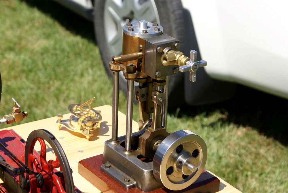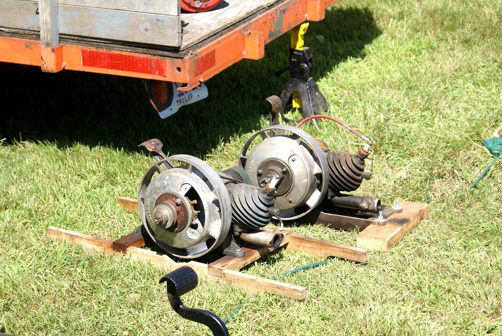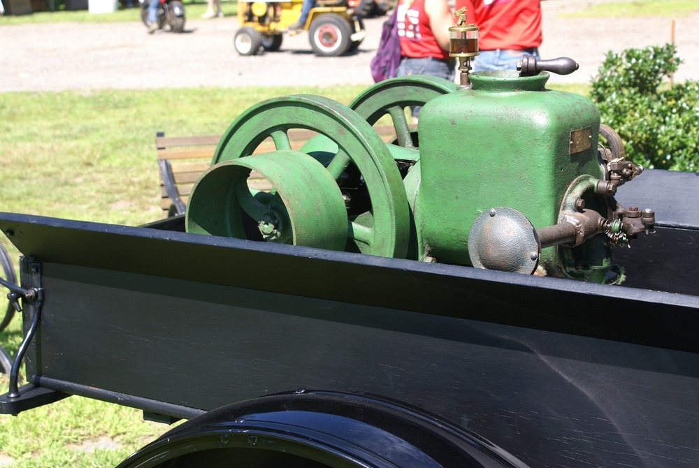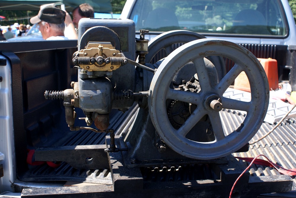 The device with the orange fly wheel is what I refer to as an electric "one lunger". When a small pin rotating with the shaft hits a brass brush assembly the solenoid is activated and turns the flywheel. The brush assembly is a piece of thin brass sheet bent in such a way that the pin contacts it at the proper point of rotation to keep the engine turning. The brass brush is bent in such a way that the amount of revolution with the pin connected can be varied setting the speed. The barely visible brass loop seen at the top of the device controls the contact period and hence the speed.